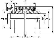 型號(hào) | 公稱轉(zhuǎn)矩 Tn /N·m | 許可轉(zhuǎn)速[n] /r·min-1 | 軸孔直徑 d1、d2 | 軸孔長(zhǎng)度 L J1 | D | D1 | B | B1 | S | d | 質(zhì)量m/kg | 轉(zhuǎn)動(dòng)慣量I /kg·m2 | |||||
